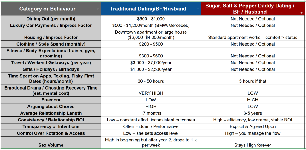 So, as I was setting poolside in Medellรญn, Colombia working on my other biz https://RemoteBizIncome.com, I decided to set down and actually tally up all the hard costs and time costs (estimated) I was spending or needed to keep spending, in order to date or marry a high worth woman someday. I wanted to compare these traditional “built in costs” to my Sugar, Salt & Pepper Daddy RMS to see how it stacked up. When I was done, I must admit, even I was shocked at how lopsided the savings in time & money my chart showed!